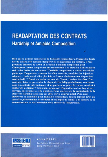 Bien que le pouvoir modérateur de l'amiable compositeur à l'égard des droits nés du contrat soit reconnu (tempérer les conséquences du contrat), le vrai problème demeure de savoir si la clause d'amiable composition peut s'interpréter comme comportant une renonciation à se prévaloir d'une sanction stricte des droits nés du contrat. L'amiable compositeur a le droit de réduire plutôt que d'augmenter, atténuer les effets excessifs, empêcher les injustices criantes,... mais peut-il aller plus loin et écarter résolument une disposition contractuelle ? Peut-il au moins, au nom de l'équité, corriger les effets d'un contrat et faire ce que réalise la clause de Hardship généralement rencontrée dans les contrats internationaux si les parties à ce genre de contrat venaient à oublier de la stipuler? Nous nous proposons d'apporter, tout au long de cet ouvrage, une réponse à cette question. Nous analyserons la particularité de la clause de Hardship ainsi que ces effets sur le contrat initial. Puis, nous étudierons la possibilité pour l'amiable compositeur, dont la mission revêt un caractère juridictionnel, de modérer ou d'adapter le contrat à la lumière de la reconnaissance ou de l'admission de la théorie de l'imprévision.