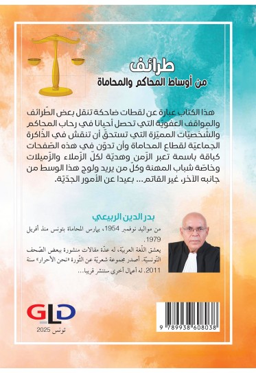 - هذا الكتاب عبارة عن لقطات ضاحكة تنقل بعض الطرائف والمواقف العفوية التي تحصل أحيانا في رحاب المحاكم والشخصيات المميّزة التي تستحق أن تنقش في الذاكرة الجماعيّة لقطاع المحاماة وأن تدوّن في هذه الصفحات كباقة باسمة تعبر الزمن وهديّة لكل الزملاء والزميلات وخاصة شباب المهنة وكل من يريد ولوج هذا الوسط من جانبه الآخر، غير القاتم ... بعيدا عن الأمور الجدية.