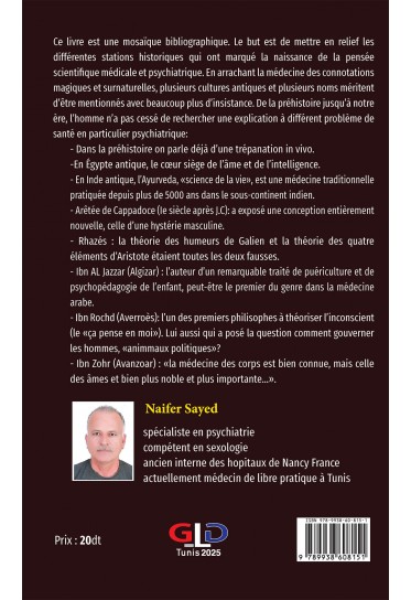 Ce livre est une mosaïque bibliographique. Le but est de mettre en relief les différentes stations historiques qui ont marqué la naissance de la pensée scientifique médicale et psychiatrique. En arrachant la médecine des connotations magiques et surnaturelles, plusieurs cultures antiques et plusieurs noms méritent d'être mentionnés avec beaucoup plus d'insistance. De la préhistoire jusqu'à notre ère, l'homme n'a pas cessé de rechercher une explication à différent problème de santé en particulier psychiatrique: