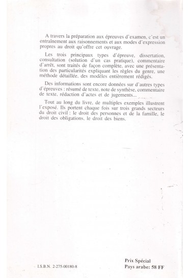 Les trois principaux types d'épreuve, dissertation, consultation (solution d'un cas pratique), commentaire d'arrêt, sont traités de façon complète, avec une présenta- tion des particularités expliquant les règles du genre, une méthode détaillée, des modèles entièrement rédigés.
