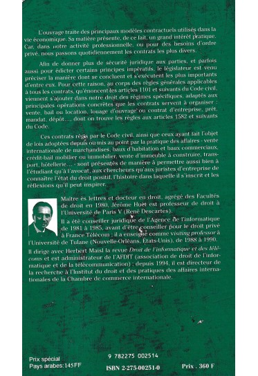 Ces contrats régis par le Code civil, ainsi que ceux ayant lait l'objet de lois adoptées depuis ou mis au point par la pratique des affaires - vente internationale de marchandises, baux d'habitation et baux commerciaux, crédit-bail mobilier ou immobilier, vente d'immeuble à construire, trans- port, hôtellerie... - sont présentés de manière à permettre aussi bien à l'étudiant qu'à l'avocat, aux chercheurs qu'aux juristes d'entreprise de connaître l'état du droit positif, l'histoire dans laquelle il s'inscrit et les réflexions qu'il peut inspirer.