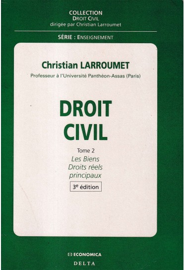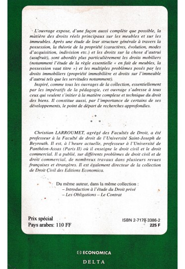 L'ouvrage expose, d'une façon aussi complète que possible, la matière des droits réels principaux sur les meubles et sur les immeubles. Après une étude de leur structure générale à travers la possession, la théorie de la propriété (caractères, évolution, modes d'acquisition, indivision etc.) et les droits sur la chose d'autrui (usufruit), sont abordés plus particulièrement les droits mobiliers (notamment l'étude de la règle essentielle « en fait de meubles, la possession vaut titre ») et les multiples problèmes posés par les droits immobiliers (propriété immobilière et droits sur l'immeuble d'autrui tels que les servitudes notamment).