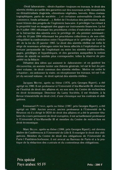 Débattre des idées qui animent le «laboratoire» et en guident les découvertes, en somme tenter une théorie générale, tel est le but du pre- mier volume, «le droit commun des sûretés réelles». Mettre en ordre le "chantier», en ordonner la visite, en réceptionner les travaux, tel est l'ob- jet du second volume, le droit spécial des sûretés réelles».