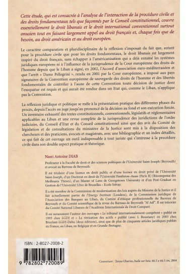 Cette étude, qui est consacrée à l'analyse de l'interaction de la procédure civile et des droits fondamentaux tels que façonnés par le Conseil constitutionnel, couvre essentiellement le droit libanais et le droit international conventionnel surtout onusien tout en faisant largement appel au droit français et, chaque fois que de besoin, au droit américain et au droit européen.