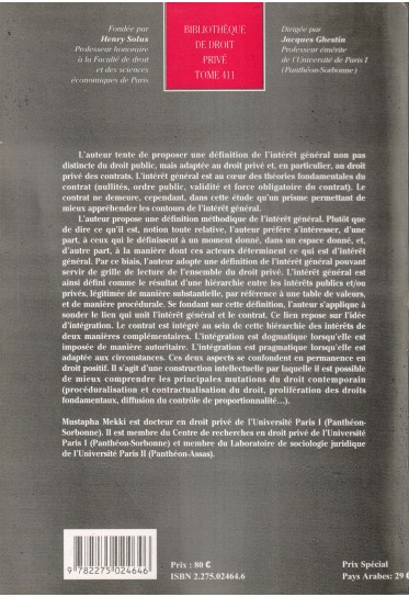 L'auteur propose une définition méthodique de l'intérêt général. Plutôt que de dire ce qu'il est, notion toute relative, l'auteur préfère s'intéresser, d'une part, à ceux qui le définissent à un moment donné, dans un espace donné, et, d'autre part, à la manière dont ces acteurs déterminent ce qui est d'intérêt général. Par ce biais, l'auteur adopte une définition de l'intérêt général pouvant servir de grille de lecture de l'ensemble du droit privé. L'intérêt général est ainsi défini comme le résultat d'une hiérarchie entre les intérêts publics et/ou privés, légitimée de manière substantielle, par référence à une table de valeurs, et de manière procédurale. Se fondant sur cette définition, l'auteur s'applique à sonder le lien qui unit l'intérêt général et le contrat. Ce lien repose sur l'idée d'intégration. Le contrat est intégré au sein de cette hiérarchie des intérêts de deux manières complémentaires. L'intégration est dogmatique lorsqu'elle est imposée de manière autoritaire. L'intégration est pragmatique lorsqu'elle est adaptée aux circonstances. Ces deux aspects se confondent en permanence en droit positif. Il s'agit d'une construction intellectuelle par laquelle il est possible de mieux comprendre les principales mutations du droit contemporain (procéduralisation et contractualisation du droit, prolifération des droits fondamentaux, diffusion du contrôle de proportionnalité...)