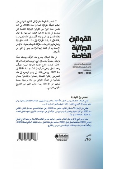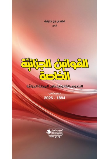 في هذا السياق، يندرج هذا المؤلف بوصفه عملاً توثيقياً ومنهجياً يهدف إلى جمع وتبويب القوانين الجزائية الخاصة الواردة خارج المجلة الجزائية ضمن مصنف واحد، يشمل نصوصاً تمتد زمنياً من سنة 1894 إلى سنة 2026، ويسعى بذلك إلى تيسير الرجوع إلى هذه النصوص وتمكين القضاة والمحامين والباحثين وسائر المتدخلين في الشأن الجزائي من أداة مرجعية جامعة تعينهم على الإحاطة بهذا الجانب المهم من التشريع الجزائي التونسي.