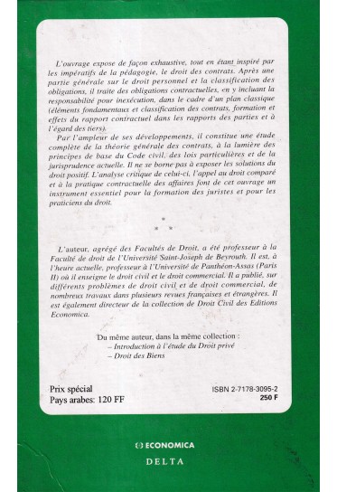 Par l'ampleur de ses développements, il constitue une étude complète de la théorie générale des contrats, à la lumière des principes de base du Code civil, des lois particulières et de la jurisprudence actuelle. Il ne se borne pas à exposer les solutions du droit positif. L'analyse critique de celui-ci, l'appel au droit comparé et à la pratique contractuelle des affaires font de cet ouvrage un instrument essentiel pour la formation des juristes et pour les praticiens du droit.